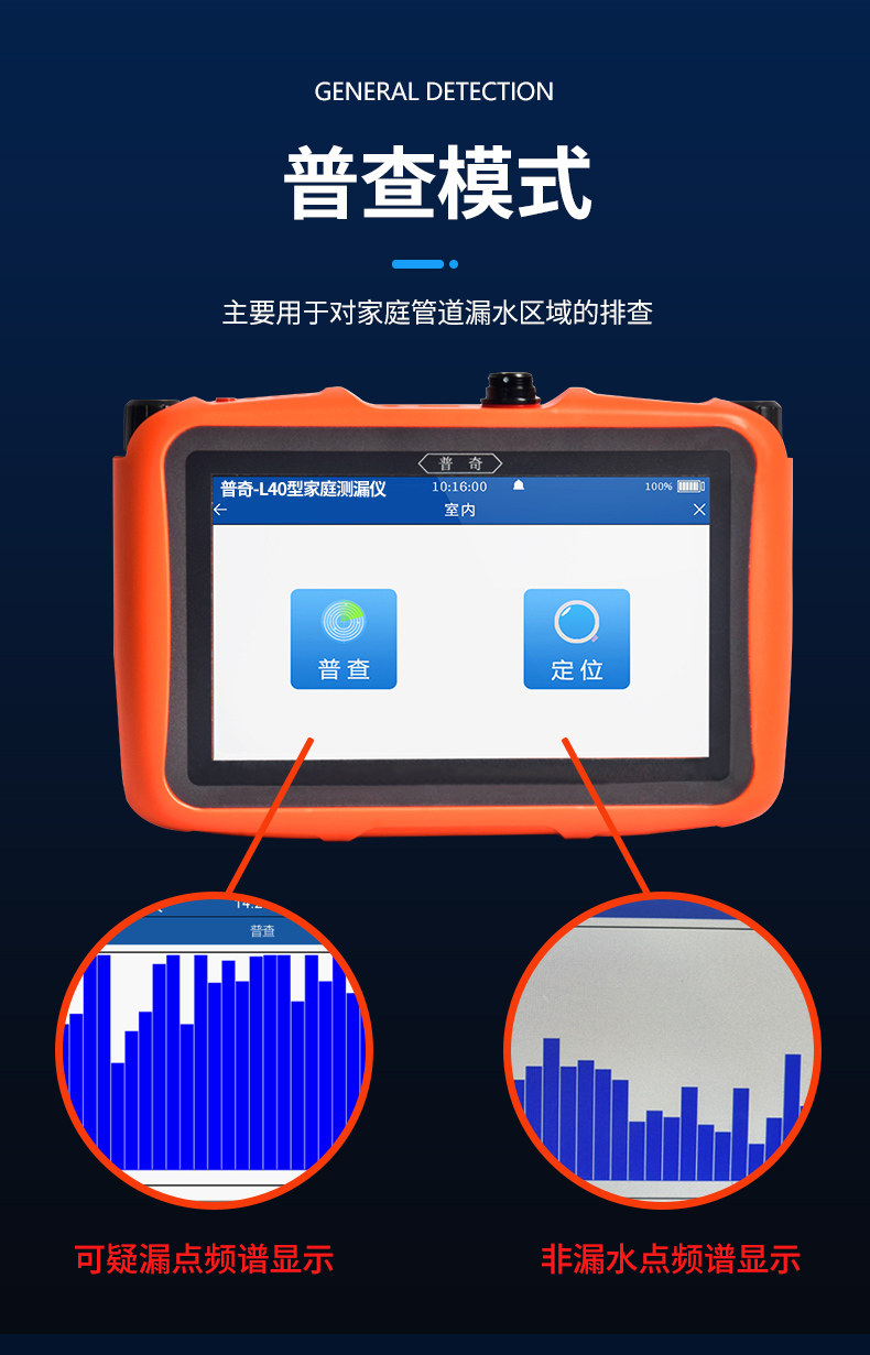 | 工作模式 | 普查模式(大范围漏水区域漏水排查可疑漏水区域) |