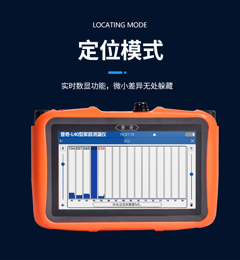 普奇L40家庭管道漏水检测仪通过传感器将漏水声音信号进行采集,采集后的信号通过主机处理,以可视化频谱及信号柱的方式显示在主机屏幕上,同时声音也会通过主机输出到耳机,通过“听”、“看”两种方式结合,分析判断漏水点。“普查模式”+“定位模式”双重锁定漏水点,能够精准、快速、有效的解决各类家庭管道的漏水问题。