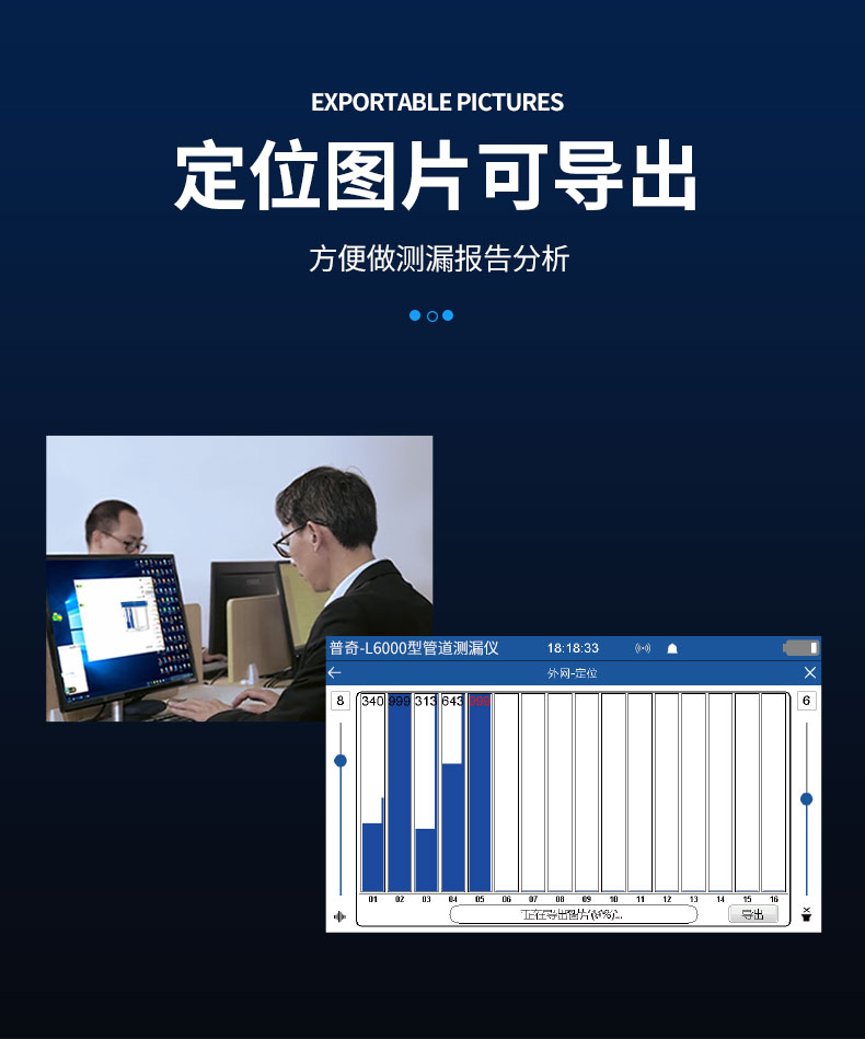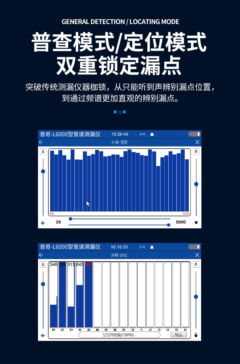 普奇L6000 管道漏水检测仪通过传感器将漏水声音信号进行采集,采集后的信号通过主机处理,以可视化频谱及信号柱的方式显示在主机屏幕上,同时声音也会通过主机输出到耳机,通过“听”、“看”两种方式结合,分析判断漏水点。