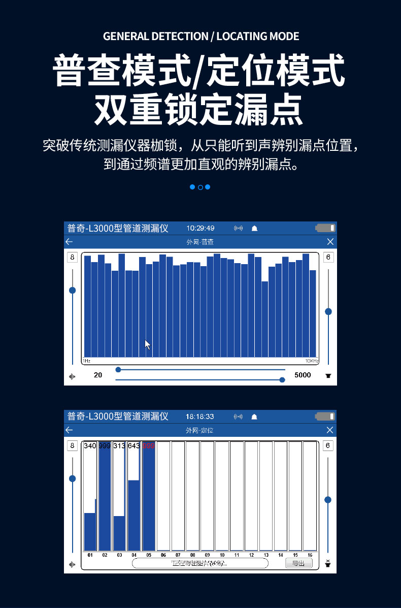 普奇L3000 管道漏水检测仪通过传感器将漏水声音信号进行采集,采集后的信号通过主机处理,以可视化频谱及信号柱的方式显示在主机屏幕上,同时声音也会通过主机输出到耳机,通过“听”、“看”两种方式结合,分析判断漏水点。
