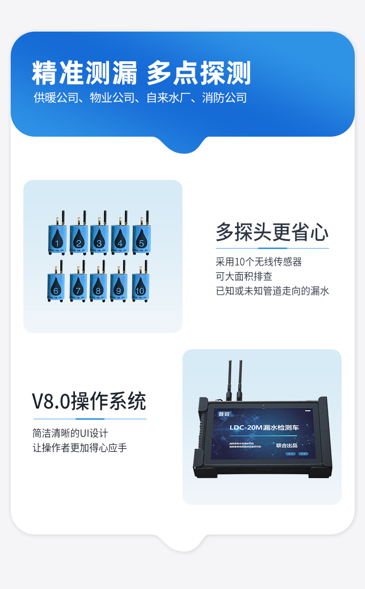 普奇PQ-LDC-10M漏水检测车是我院新研发的一款高精度、高效率的压力管网降损查漏设备,主要用于在已知或未知管道走向的情况下,大面积快速对供水、供热、消防等管道进行漏水检测和巡查工作