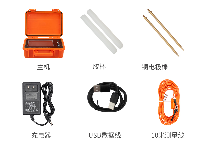 | 部件清单 | 主机(含电池)、胶棒、铜电极棒、10米测量线、充电器、USB数据线、说明书 |