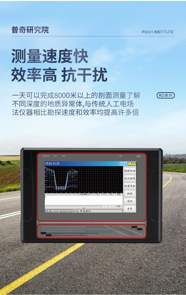 普奇PQ-KD50系列自动成图空洞仪是是利用大地天然电场源不需要通过人工电场即省略了笨拙的供电系统从而实现了操作简单,仪器轻巧。经过仪器采集的数据通过仪器独有内置的运算功能实现了自动呈现曲线图、地质剖面图,根据剖面图清晰的了解地质层结构,可快速的确定岩层、溶洞、含水层等具体信息 。