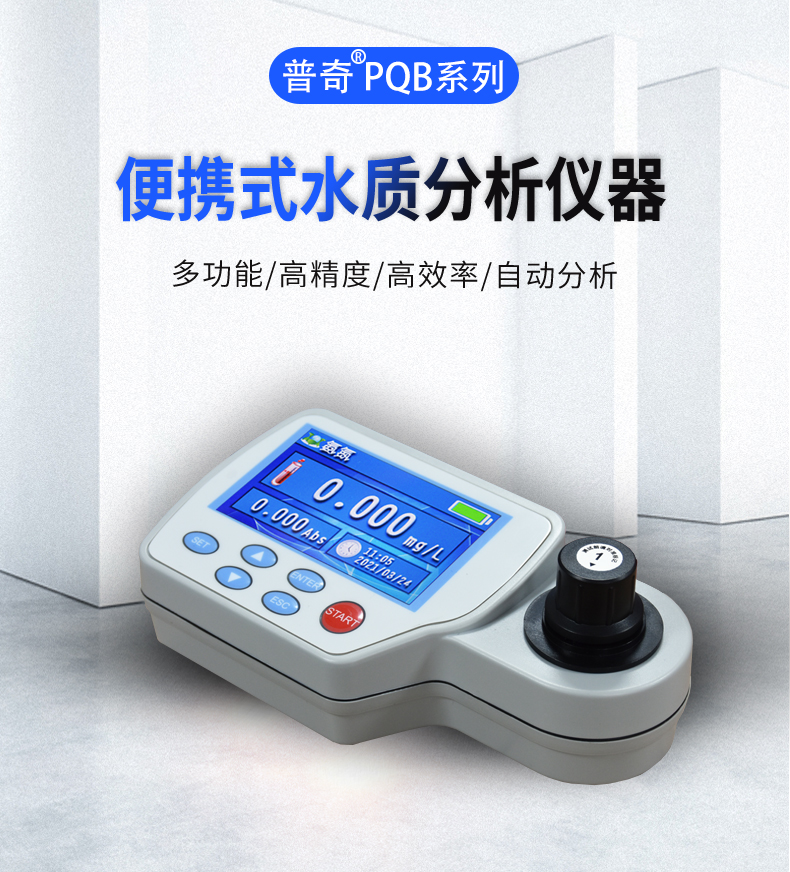 普奇PQB便携式水质分析仪是我单位针对环保、工矿企业及大专院校和科研院所等部门需求研制开发的新一代水质测定仪。该仪器由发射光源、玻璃比色皿、新型光学系统、信号控制放大系统、微处理器智能控制和分析结果自动显示系统及相应的化学试剂盒构成。可单独选择测定六价铬、锰、铁、氟化物、总磷、氨氮、亚硝酸盐、色度、浊度、铝、硫酸盐、铜、锌、等40种组分和参数。