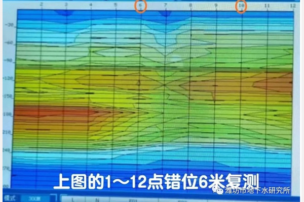 对于只利用水平成层的打井找水仪图,如果是用单通道打井找水仪测的,错位复测可以不做,可以直接分析是否可以定井。但对于在横向上出现的竖直的低值或高值异常点,不论是蓝柱子、红柱子、v字形、楔形、高低值接触带,还是局部的低值块,都应该做错位复测。